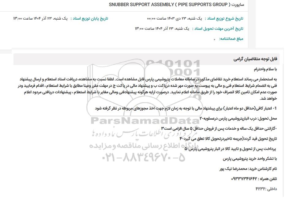 استعلام بها و موضوع استعلام استعلام ساپورت SNUBBER SUPPORT ASSEMBLY (PIPE SUPPORTS GROUP ) به اطلاع کلیه شرکتها و افراد متخصص واجد شرایط میرساند، آگهی گذار در نظر دارد از طریق استعلام بها، نسبت به انتخاب و دریافت پیشنهادات اقدام نماید. این استعلام با کد آگهی ثبت شده در سامانه خبرگزاری پارس نماد : 9995281 منتشر شده است. مشخصات استعلام : تاریخ شروع استعلام: 1404/09/23 آخرین مهلت ارسال پیشنهاد قیمت : 1404/09/23 و محل اجرای پروژه : استان بوشهر میباشد. استعلام قیمت مورد درخواست : استعلام ساپورت SNUBBER SUPPORT ASSEMBLY (PIPE SUPPORTS GROUP ) با دستهبندیهای تخصصی و گروه های مرتبط : قطعات لاستیکی, لوله و اتصالات, تجهیزات نفت و گاز, استعلام اطلاع رسانی میگردد.