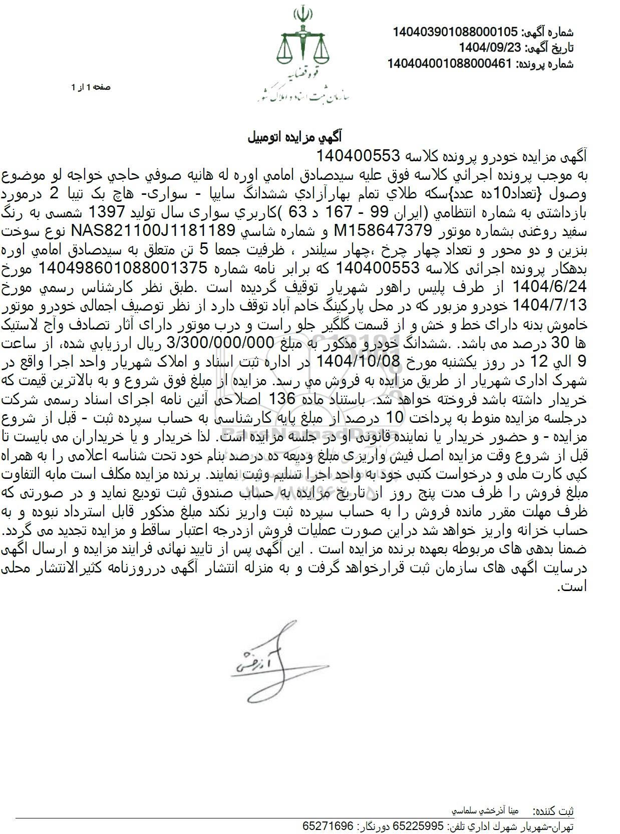 به موجب پرونده اجرائی کلاسه فوق علیه سید صادق امامی اوره له هانیه صوفی حاجی خواجه لو موضوع وصول تعداد 10 ده عدد سکه طلای تمام بهار آزادی ششدانگ سایپا - سواری هاچ بک تیبا 2 در مورد بازداشتی به شماره انتظامی ایران (99 - 167 د 63 ) کاربری سواری سال تولید 1397 شمسی به رنگ سفید روغنی بشماره موتور M158647379 و شماره شاسی NAS8211001181189 نوع سوخت بنزین و دو محور و تعداد چهار چرخ چهار سیلندر ، ظرفیت جمعا 5 تن متعلق به سید صادق امامی اوره بدهکار پرونده اجرائی کلاسه 140400553 که برابر نامه شماره 140498601088001375 مورخ 1404.6.24 از طرف پلیس راهور شهریار توقیف گردیده است طبق نظر کارشناس رسمی مورخ 1404.7.13 خودرو مزبور که در محل پارکینگ خادم آباد توقف دارد از نظر توصیف اجمالی خودرو موتور خاموش بدنه دارای خط و خش و از قسمت گلگیر جلو راست و درب موتور دارای آثار تصادف واج لاستیک ها 30 درصد می باشد ششدانگ خودرو مذکور به مبلغ 3.300.000.000 ریال ارزیابی شده از ساعت و الی 12 در روز یکشنبه مورخ 1404.10.08 در اداره ثبت اسناد و املاک شهریار واحد اجرا واقع در شهرک اداری شهریار از طریق مزایده به فروش میرسد مزایده از مبلغ فوق شروع و به بالاترین قیمت که خریدار داشته باشد فروخته خواهد شد باستناد ماده 136 اصلاحی آئین نامه اجرای اسناد رسمی شرکت در جلسه مزایده منوط به پرداخت 10 درصد از مبلغ پایه کارشناسی به حساب سپرده ثبت - قبل از شروع مزایده - و حضور خریدار یا نماینده قانونی او در جلسه مزایده است. لذا خریدار و یا خریداران می بایست تا قبل از شروع وقت مزایده اصل فیش واریزی مبلغ ودیعه ده درصد بنام خود تحت شناسه اعلامی را به همراه کپی کارت ملی و درخواست کتبی خود به واحد اجرا تسلیم و ثبت نمایند برنده مزایده مکلف است مابه التفاوت مبلغ فروش را ظرف مدت پنج روز از تاریخ مزایده به حساب صندوق ثبت تودیع نماید و در صورتی که ظرف مهلت مقرر مانده فروش را به حساب سپرده ثبت واریز نکند مبلغ مذکور قابل استرداد نبوده و به حساب خزانه واریز خواهد شد در این صورت عملیات فروش از درجه اعتبار ساقط و مزایده تجدید می گردد. ضمنا بدهی های مربوطه بعهده برنده مزایده است. این آگهی پس از تایید نهایی فرایند مزایده و ارسال آگهی در سایت آگهی های سازمان ثبت قرار خواهد گرفت و به منزله انتشار آگهی در روزنامه کثیر الانتشار محلی است.