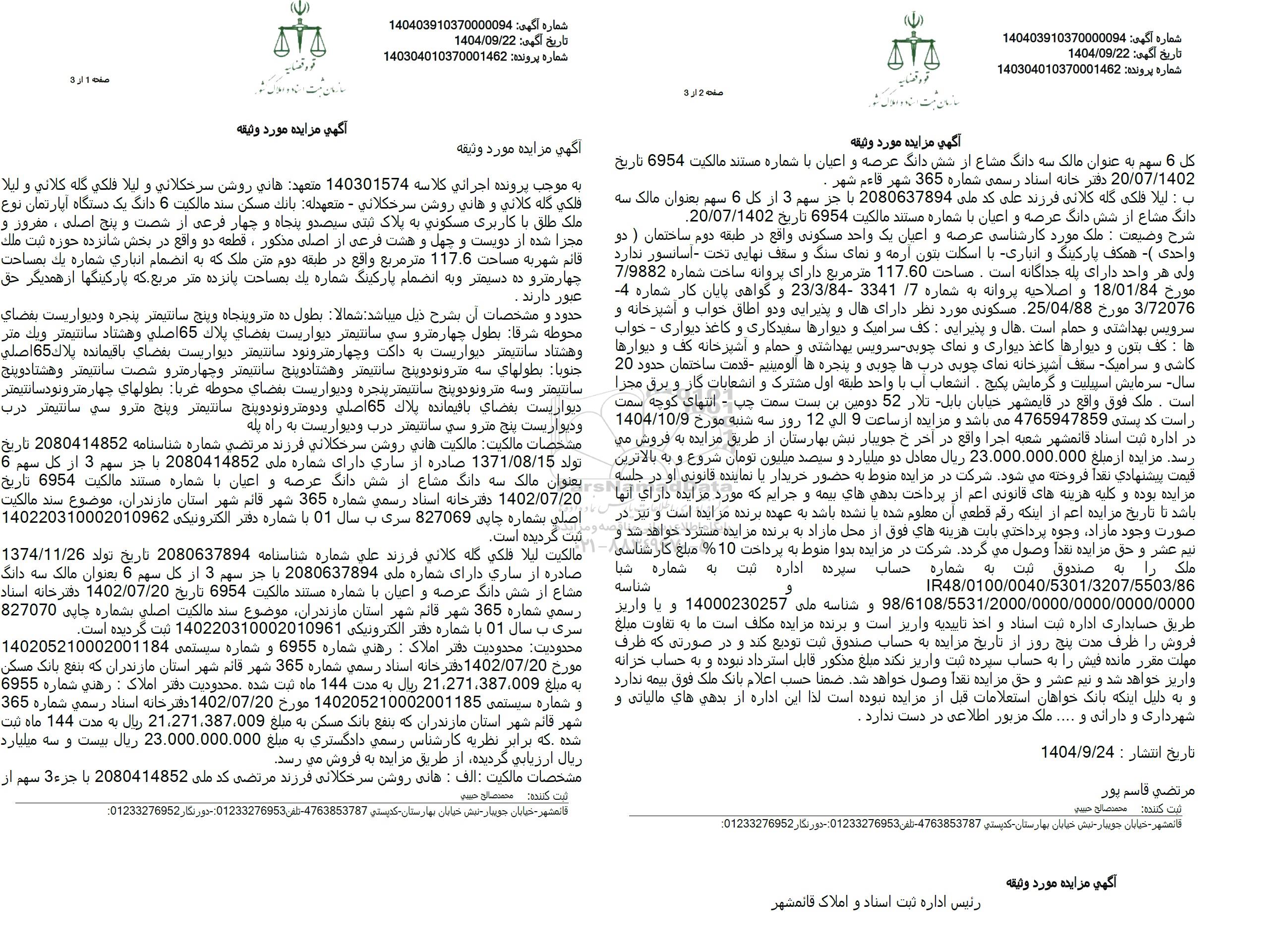 مشخصات مالکیت : الف : هانی روشن سرخکلانی فرزند مرتضی کد ملی 2080414852 با جزء 3 سهم از کل 6 سهم به عنوان مالک سه دانگ مشاع از شش دانگ عرصه و اعیان با شماره مستند مالکیت 6954 تاریخ 1404.08.20 دفتر خانه اسناد رسمی شماره 365 شهر قائم شهر