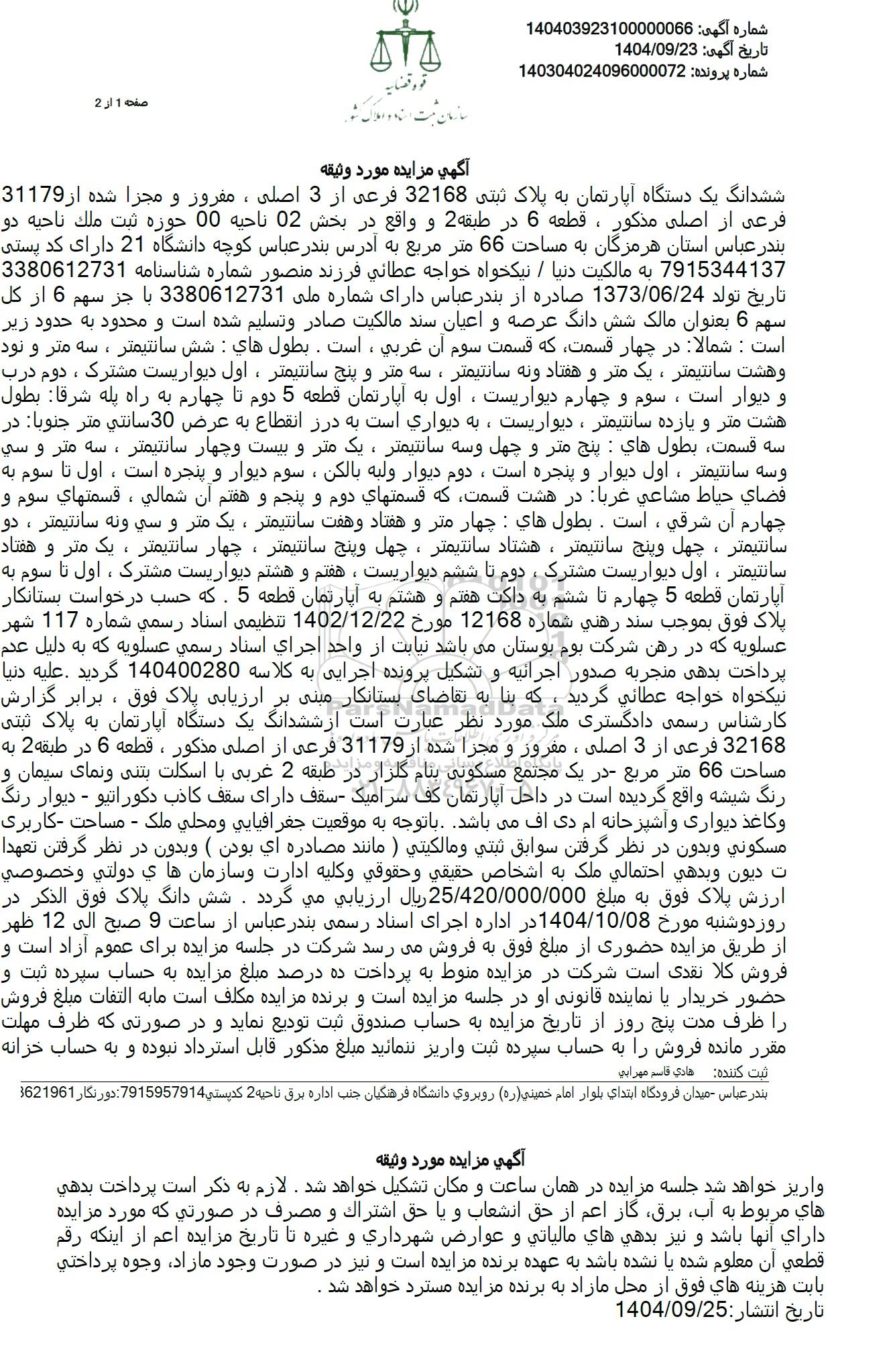 ششدانگ یک دستگاه آپارتمان به پلاک ثبتی 32168 فرعی از 3 اصلی، مفروز و مجزا شده از 31179 فرعی از اصلی مذکور ، قطعه 6 در طبقه 2 و واقع در بخش 02 ناحیه 00 حوزه ثبت ملک ناحیه دو بندر عباس استان هرمزگان به مساحت 66 متر مربع به آدرس بندر عباس کوچه دانشگاه 21 دارای کد پستی 7915344137 به مالکیت دنیا . نیکخواه خواجه عطائی فرزند منصور شماره شناسنامه 3380612731 تاریخ تولد 1373.06.24 صادره از بندر عباس دارای شماره ملی 3380612731 با جز سهم 6 از کل سهم 6 بعنوان مالک شش دانگ عرصه و اعیان سند مالکیت صادر و تسلیم شده است و محدود به حدود زیر است: شمالا در چهار قسمت که قسمت سوم آن غربی ، است. بطول های : شش سانتیمتر ، سه متر و نود و هشت سانتیمتر، یک متر و هفتاد و نه سانتیمتر ، سه متر و پنج سانتیمتر، اول دیواریست مشترک ، دوم درب و دیوار است ، سوم و چهارم دیواریست، اول به آپارتمان قطعه 5 دوم تا چهارم به راه پله شرقا بطول هشت متر و یازده سانتیمتر، دیواریست، به دیواری است به درز انقطاع به عرض 30 سانتی متر جنوبا در سه قسمت بطول های : پنج متر و چهل و سه سانتیمتر ، یک متر و بیست و چهار سانتیمتر ، سه متر و سی و سه سانتیمتر ، اول دیوار و پنجره است، دوم دیوار ولبه بالکن ، سوم دیوار و پنجره است ، اول تا سوم به فضای حیاط مشاعی غربا در هشت قسمت که قسمتهای دوم و پنجم و هفتم آن شمالی ، قسمتهای سوم و چهارم آن شرقی ، است. بطول های : چهار متر و هفتاد و هفت سانتیمتر ، یک متر و سی ونه سانتیمتر ، دو سانتیمتر، چهل و پنج سانتیمتر، هشتاد سانتیمتر ، چهل و پنج سانتیمتر، چهار سانتیمتر ، یک متر و هفتاد سانتیمتر ، اول دیواریست مشترک ، دوم تا ششم دیواریست ، هفتم و هشتم دیواریست مشترک ، اول تا سوم به آپارتمان قطعه 5 چهارم تا ششم به داکت هفتم و هشتم به آپارتمان قطعه 5 . که حسب درخواست بستانکار پلاک فوق فوق بموجب سند رهنی شماره 12168 مورخ 1402.12.22 تنظیمی اسناد رسمی شماره 117 شهر عسلویه که در رهن شرکت بوم بوستان میباشد نیابت از واحد اجرای اسناد رسمی عسلویه که به دلیل عدم پرداخت بدهی منجر به صدور اجرائیه و تشکیل پرونده اجرایی به کلاسه 140400280 گردید . علیه دنیا نیکخواه خواجه عطانی گردید ، که بنا به تقاضای بستانکار مبنی بر ارزیابی پلاک فوق ، برابر گزارش کارشناس رسمی دادگستری ملک مورد نظر عبارت است از ششدانگ یک دستگاه آپارتمان به پلاک ثبتی 32168 فرعی از 3 اصلی ، مفروز و مجزا شده از 31179 فرعی از اصلی مذکور ، قطعه 6 در طبقه 2 به مساحت 66 متر مربع در یک مجتمع مسکونی بنام گلزار در طبقه 2 غربی با اسکلت بتنی و نمای سیمان و رنگ شیشه واقع گردیده است در داخل آپارتمان کف سرامیک سقف دارای سقف کاذب دکوراتیو - دیوار رنگ وکاغذ دیواری و آشپزخانه ام دی اف می باشد. با توجه به موقعیت جغرافیایی و محلی ملک - مساحت کاربری مسکونی و بدون در نظر گرفتن سوابق ثبتی ومالکیتی ( مانند مصادره ای بودن ( و بدون در نظر گرفتن تعهدا ت دیون وبدهی احتمالی ملک به اشخاص حقیقی و حقوقی وکلیه ادارت و سازمانهای دولتی و خصوصی ارزش پلاک فوق به مبلغ 25.420.000.000 ریال ارزیابی می گردد . شش دانگ پلاک فوق الذکر در روز دوشنبه مورخ 1404.10.08 در اداره اجرای اسناد رسمی بندر عباس از ساعت 9 صبح الى 12 ظهر از طریق مزایده حضوری از مبلغ فوق به فروش میرسد شرکت در جلسه مزایده برای عموم آزاد است و فروش کلا نقدی است شرکت در مزایده منوط به پرداخت ده درصد مبلغ مزایده به حساب سپرده ثبت و حضور خریدار یا نماینده قانونی او در جلسه مزایده است و برنده مزایده مکلف است ما به التفات مبلغ فروش را ظرف مدت پنج روز از تاریخ مزایده به حساب صندوق ثبت تودیع نماید و در صورتی که ظرف مهلت مقرر مانده فروش را به حساب سپرده ثبت واریز ننمائید مبلغ مذکور قابل استرداد نبوده و به حساب خزانه واریز خواهد شد جلسه مزایده در همان ساعت و مکان تشکیل خواهد شد. لازم به ذکر است پرداخت بدهی های مربوط به آب برق گاز اعم از حق انشعاب و یا حق اشتراک و مصرف در صورتی که مورد مزایده دارای آنها باشد و نیز بدهی های مالیاتی و عوارض شهرداری و غ