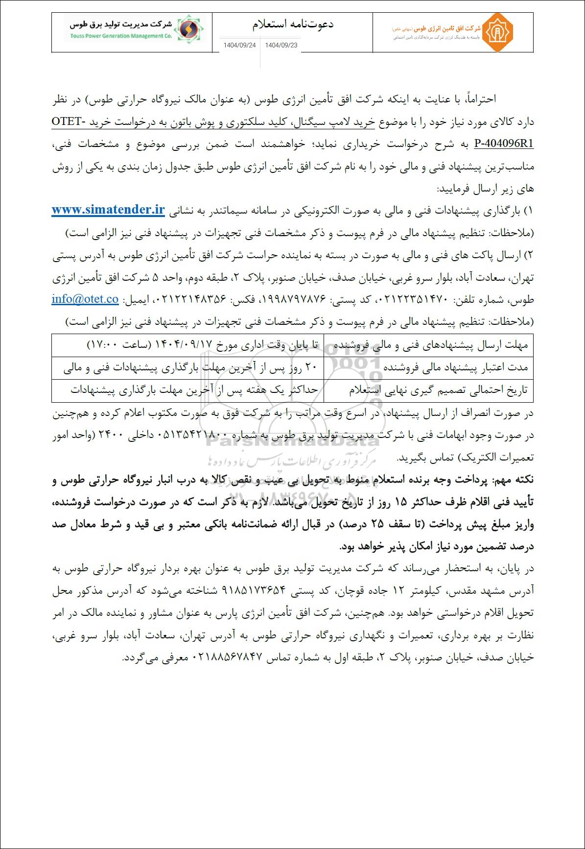 احتراماً ، با عنایت به اینکه شرکت افق تأمین انرژی طوس (به عنوان مالک نیروگاه حرارتی طوس) در نظر دارد کالای مورد نیاز خود را با موضوع خرید لامپ سیگنانل، کلید سلکتوری و پوش باتون مورد نیاز نیروگاه حرارتی طوس به درخواست خرید OTET -P-404096 به شرح درخواست خریداری نماید؛ خواهشمند است ضمن بررسی موضوع و مشخصات فنی، مناسب ترین پیشنهاد فنی و مالی خود را به نام شرکت افق تأمین انرژی طوس طبق جدول زمان بندی به یکی از روش های زیر ارسال فرمایید:
