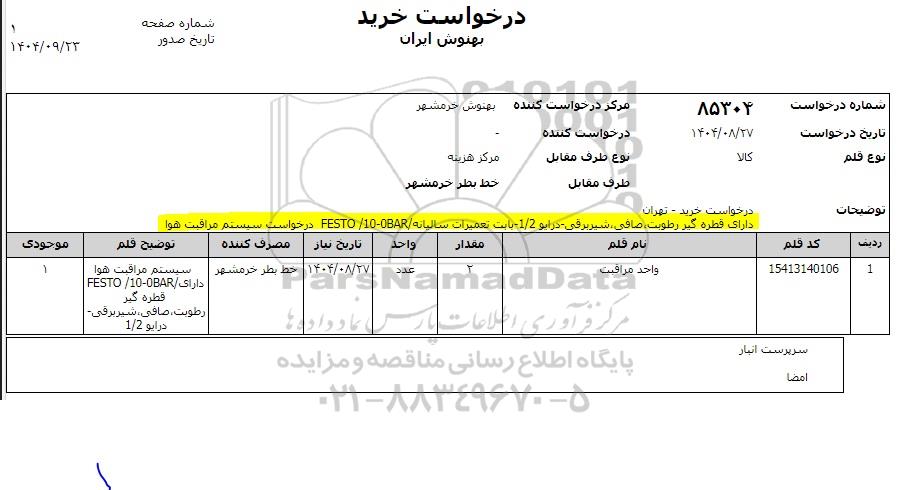 | 1 | 15413140106 | واحد مراقبت | 2 | عدد | 1404.08.27 | خط بطر خرمشهر | سیستم مراقبت هوا دارای FESTO /10-0BAR دارای قطره گیر رطوبت ، صافی ، شیر برقی ، درایو 1.2 | 1 |