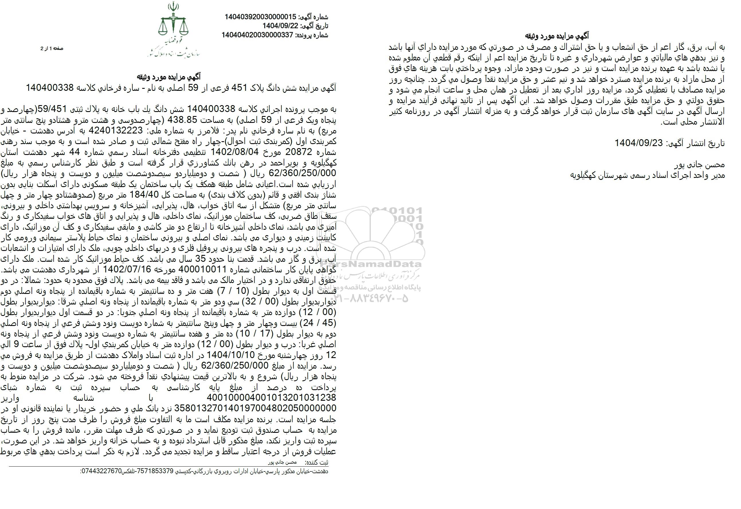 آگهی مزایده شش دانگ پلاک 451 فرعی از 59 اصلی به نام - ساره فرخانی کلاسه 140400338