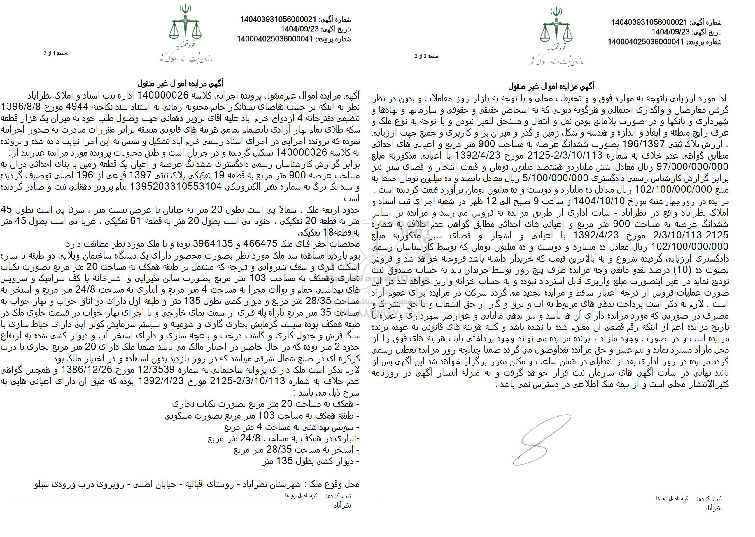 تاریخ مزایده از ساعت 9 الی 12 مورخ 14.4.10.10 در شعبه اجرای ثبت اسناد و املاک نظرآباد