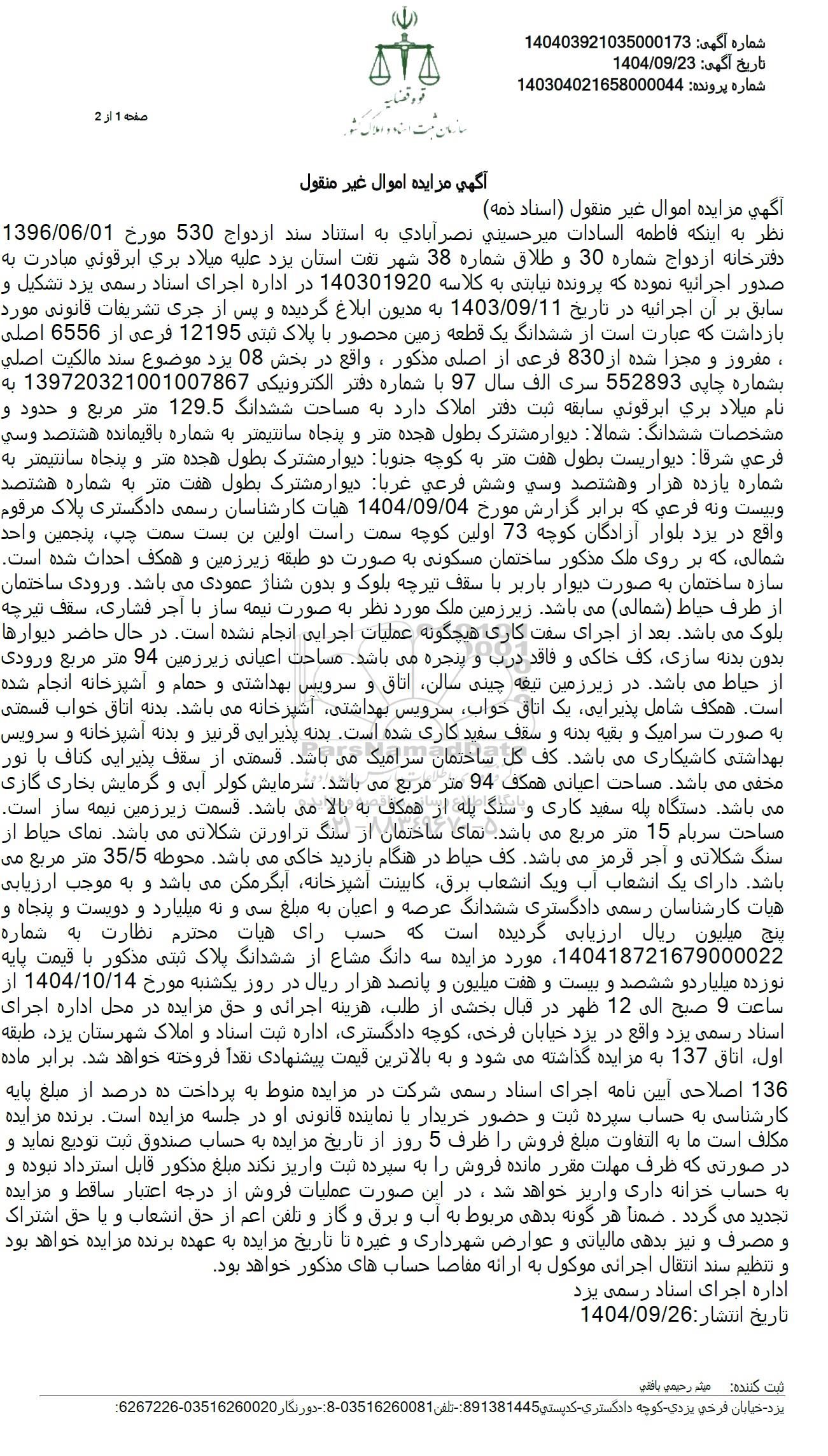 نظر به اینکه فاطمه السادات ميرحسيني نصر آبادی به استناد سند ازدواج 530 مورخ 1396.06.01 دفترخانه ازدواج شماره 30 و طلاق شماره 38 شهر تفت استان يرد عليه ميلاد بری ابرقوني مبادرت به صدور اجرائیه نموده که پرونده نیابتی به کلاسه 140301920 در اداره اجرای اسناد رسمی یرد تشکیل و سابق بر آن اجرائیه در تاریخ 1403.09.11 به مدیون ابلاغ گردیده و پس از جری تشریفات قانونی مورد بازداشت که عبارت است از ششدانگ یک قطعه زمین محصور با پلاک ثبتی 12195 فرعی از 6556 اصلی مفروز و مجزا شده از 830 فرعی از اصلی مذکور، واقع در بخش 08 یزد موضوع سند مالكيت اصلي بشماره چاپی 552893 سری الف سال 97 با شماره دفتر الکترونیکی 139720321001007867 به نام میلاد بری ابرقوني سابقه ثبت دفتر املاک دارد به مساحت ششدانگ 129.5 متر مربع و حدود و مشخصات ششدانگ شمالا دیوار مشترک بطول هجده متر و پنجاه سانتیمتر به شماره باقیمانده هشتصد وسی فرعي شرقا دیواریست بطول هفت متر به کوچه جنوبا دیوار مشترک بطول هجده متر و پنجاه سانتیمتر به شماره یازده هزار و هشتصد و سي و شش فرعی غربا دیوار مشترک بطول هفت متر به شماره هشتصد و بیست و نه فرعی که برابر گزارش مورخ 1404.09.04 هیات کارشناسان رسمی دادگستری پلاک مرقوم واقع در یزد بلوار آزادگان کوچه 73 اولین کوچه سمت راست اولین بن بست سمت چپ، پنجمین واحد شمالی که بر روی ملک مذکور ساختمان مسکونی به صورت دو طبقه زیرزمین و همکف احداث شده است. سازه ساختمان به صورت دیوار باربر با سقف تیرچه بلوک و بدون شناژ عمودی میباشد. ورودی ساختمان از طرف حیاط (شمالی) می باشد زیر زمین ملک مورد نظر به صورت نیمه ساز با آجر فشاری سقف تیرچه بلوک میباشد. بعد از اجرای سفت کاری هیچگونه عملیات اجرایی انجام نشده است. در حال حاضر دیوارها بدون بدنه سازی کف خاکی و فاقد درب و پنجره میباشد. مساحت اعیانی زیر زمین 94 متر مربع ورودی از حیاط میباشد در زیرزمین تیغه چینی سالن اتاق و سرویس بهداشتی و حمام و آشپزخانه انجام شده است. همکف شامل پذیرایی یک اتاق خواب سرویس بهداشتی آشپزخانه میباشد. بدنه اتاق خواب قسمتی به صورت سرامیک و بقیه بدنه و سقف سفید کاری شده است. بدنه پذیرایی قرنیز و بدنه آشپزخانه و سرویس بهداشتی کاشیکاری می باشد کف کل ساختمان سرامیک میباشد. قسمتی از سقف پذیرایی کناف با نور مخفی می باشد. مساحت اعیانی همکف 94 متر مربع می باشد. سرمایش کولر آبی و گرمایش بخاری گازی می باشد دستگاه پله سفید کاری و سنگ پله از همکف به بالا میباشد قسمت زیرزمین نیمه ساز است. مساحت سریام 15 متر مربع میباشد نمای ساختمان از سنگ تراورتن شکلاتی می باشد. نمای حیاط از سنگ شکلاتی و آجر قرمز میباشد کف حیاط در هنگام بازدید خاکی میباشد. محوطه 35.5 متر مربع می باشد. دارای یک انشعاب آب و یک انشعاب برق کابینت آشپرخانه ابگرمکن میباشد و به موجب ارزیابی هیات کارشناسان رسمی دادگستری ششدانگ عرصه و اعیان به مبلغ سی و نه میلیارد و دویست و پنجاه و پنج میلیون ریال ارزیابی گردیده است که حسب رای هیات محترم نظارت به شماره 140418721679000022 مورد مزایده سه دانگ مشاع از ششدانگ پلاک ثبتی مذکور با قیمت پایه نوزده میلیارد و ششصد و بیست و هفت میلیون و پانصد هزار ریال در روز یکشنبه مورخ 1404.10.14 از ساعت 9 صبح الى 12 ظهر در قبال بخشی از طلب هزینه اجرائی و حق مزایده در محل اداره اجرای اسناد رسمی یزد واقع در یزد خیابان فرخی کوچه دادگستری اداره ثبت اسناد و املاک شهرستان برد طبقه اول اتاق 137 به مزایده گذاشته میشود و به بالاترین قیمت پیشنهادی نقداً فروخته خواهد شد. برابر ماده 136 اصلاحی آیین نامه اجرای اسناد رسمی شرکت در مزایده منوط به پرداخت ده درصد از مبلغ پایه کارشناسی به حساب سپرده ثبت و حضور خریدار با نماینده قانونی او در جلسه مزایده است. برنده مزایده مکلف است ما به التفاوت مبلغ فروش را ظرف 5 روز از تاریخ مزایده به حساب صندوق ثبت تودیع نماید و در صورتی که ظرف مهلت مقرر مانده فروش را به سپرده ثبت واریز نکند مبلغ مذکور قابل استرداد نبوده و به حساب خزانه داری وا