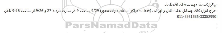 حراج انواع کالا، وسایل نقلیه قابل و اوراقی (فقط به مراکز اسقاط دارای مجوز) 9/29 ساعت 9 در ساری بازدید 27 و 9/26 از ساعت 16-9 تلفن 33352990-3361586-011