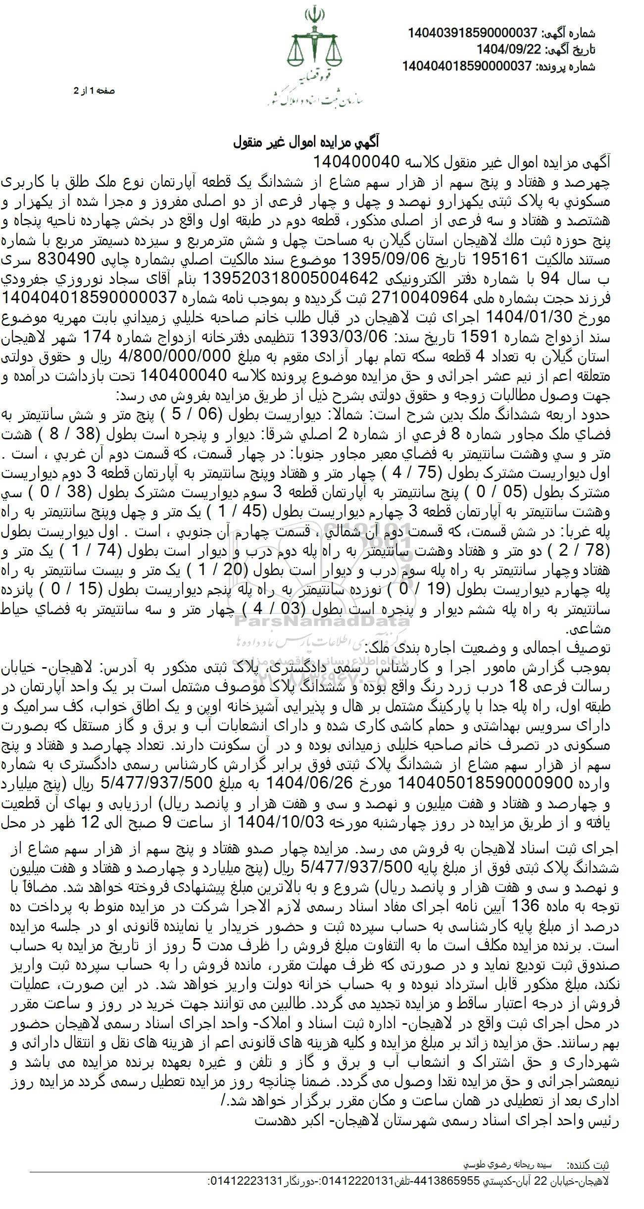 چهر صد و هفتاد و پنج سهم از هزار سهم مشاع از ششدانگ یک قطعه آپارتمان نوع ملک طلق با کاربری مسکونی به پلاک ثبتی یکهزار و نهصد و چهل و چهار فرعی از دو اصلی مفروز و مجرا شده از یکهزار و هشتصد و هفتاد و سه فرعی از اصلی مذکور قطعه دوم در طبقه اول واقع در بخش چهارده ناحیه پنجاه و پنج حوزه ثبت ملك لاهیجان استان گیلان به مساحت چهل و شش متر مربع و سیزده دسیمتر مربع با شماره مستند مالکیت 195161 تاریخ 1395.09.06 موضوع سند مالکیت اصلی بشماره چاپی 830490 سری ب سال 94 با شماره دفتر الکترونیکی 139520318005004642 بنام آقای سجاد نوروزی جفرودی فرزند حجت بشماره ملی 2710040964 ثبت گردیده و بموجب نامه شماره 140404018590000037 مورخ 1404.01.30 اجرای ثبت لاهیجان در قبال طلب خانم صاحبه خلیلی زمیدانی بابت مهریه موضوع سند ازدواج شماره 1591 تاریخ سند: 1393.03.06 تنظیمی دفترخانه ازدواج شماره 174 شهر لاهیجان استان گیلان به تعداد 4 قطعه سکه تمام بهار آزادی مقوم به مبلغ 4.800.000.000 ریال و حقوق دولتی متعلقه اعم از نیم عشر اجرائی و حق مزایده موضوع پرونده کلاسه 140400040 تحت بازداشت درآمده و جهت وصول مطالبات زوجه و حقوق دولتی بشرح ذیل از طریق مزایده بفروش می رسد