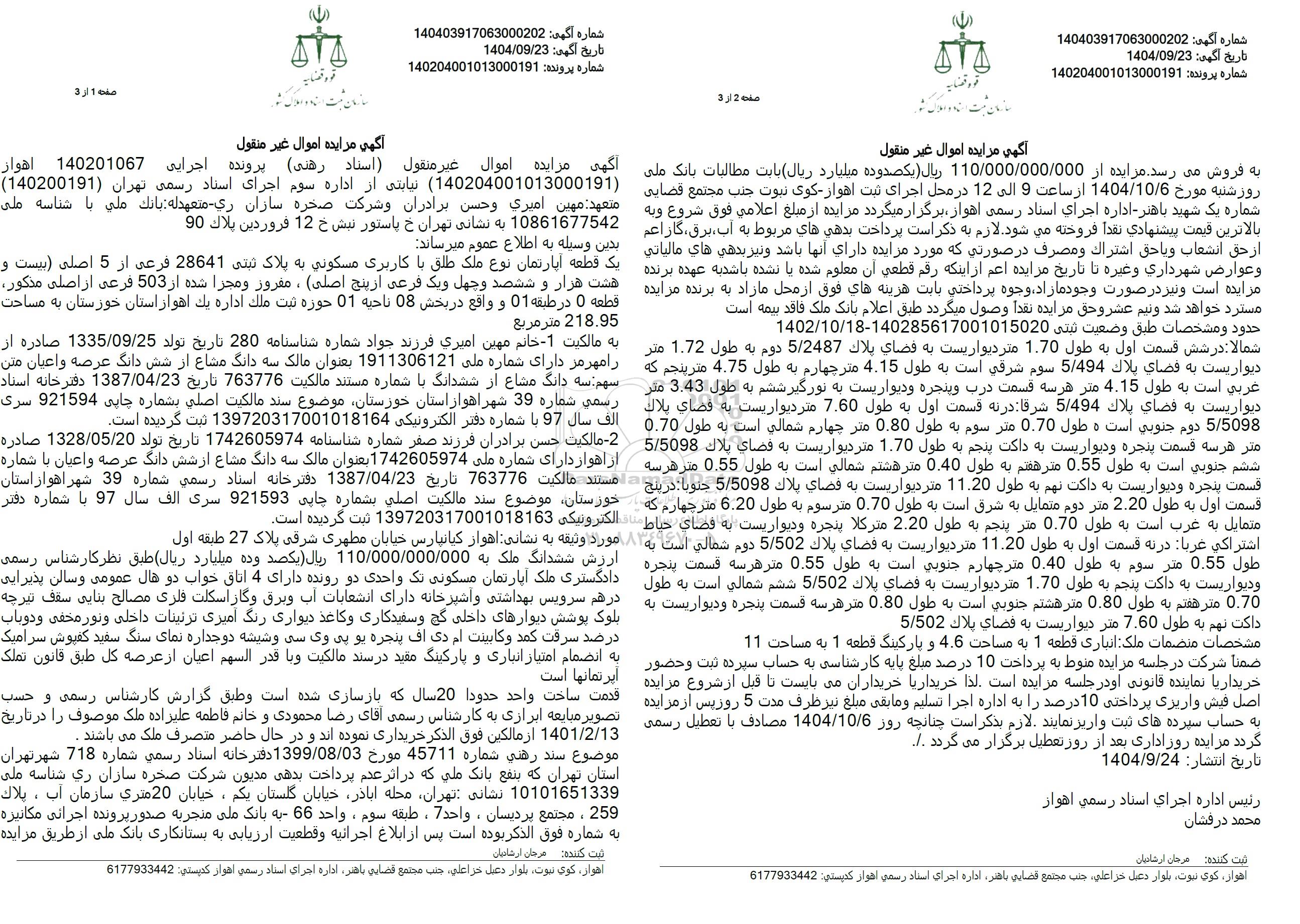اگهی مزایده اموال غیر منقول (اسناد رهنی) پرونده اجرایی 140201067 اهواز (140204001013000191) نیابتی از اداره سوم اجرای اسناد رسمی تهران (140200191) متعهد مهین امیری وحسن برادران و شرکت صخره سازان ری متعهدله : بانک ملی با شناسه ملی 10861677542 به نشانی تهران خ پاستور نبش خ 12 فروردین بلاک 90