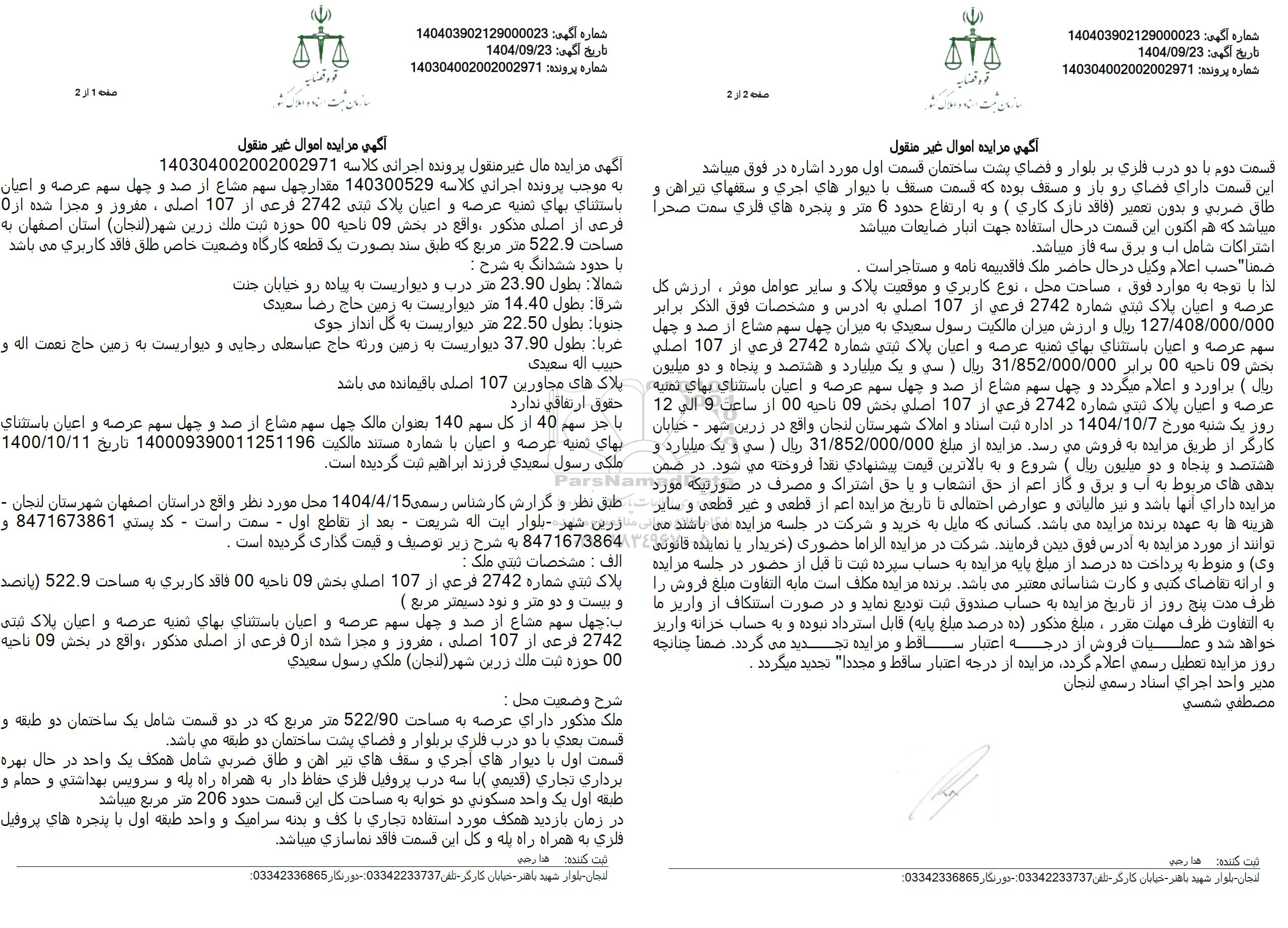 لذا با توجه به موارد فوق، مساحت محل، نوع کاربری و موقعیت پلاک و سایر عوامل موثر ، ارزش کل 127.408.000.000 ریال و ارزش میزان مالکیت رسول سعيدي به میزان چهل سهم مشاع از صد و چهل سهم عرصه و اعیان باستثناي بهاي تمنيه عرصه و اعیان پلاک ثبتی شماره 2742 فرعي از 107 اصلي بخش 09 ناحيه 00 برابر 31.852.000.000 ريال ) سي و یک میلیارد و هشتصد و پنجاه و دو میلیون ریال ) برآورد و اعلام میگردد و چهل سهم مشاع از صد و چهل سهم عرصه و اعیان باستثناي بهاي ثمنيه عرصه و اعیان پلاک ثبتی شماره 2742 فرعی از 107 اصلی بخش 09 ناحیه 00 از ساعت 9 الی 12 حقوق ارتفاقی ندارد روز یک شنبه مورخ 1404.10.7 در اداره ثبت اسناد و املاک شهرستان لنجان واقع در زرین شهر - خیابان کارگر از طریق مزایده به فروش می رسد. مزایده از مبلغ 31.852.000.000 ریال ( سی و یک میلیارد و هشتصد و پنجاه و دو میلیون ریال ( شروع و به بالاترین قیمت پیشنهادی نقدا فروخته می شود. در ضمن بدهی های مربوط به آب و برق و گار اعم از حق انشعاب و یا حق اشتراک و مصرف در صورتیکه مورد مزایده دارای آنها باشد و نیز مالیاتی و عوارض احتمالی با تاریخ مزایده اعم از قطعی و غیر قطعی و سایر هزینه ها به عهده برنده مزایده می باشد کسانی که مایل به خرید و شرکت در جلسه مزایده می باشند می توانند از مورد مزایده به آدرس فوق دیدن فرمایند. شرکت در مزایده الراما حضوری خریدار با نماینده قانونی وی و منوط به پرداخت ده درصد از مبلغ پایه مزایده به حساب سپرده ثبت تا قبل از حضور در جلسه مزایده الف : مشخصات تبتی ملک : و ارائه تقاضای کتبی و کارت شناسانی معتبر میباشد برنده مزایده مکلف است مابه التفاوت مبلغ فروش را طرف مدت پنج روز از تاریخ مزایده به حساب صندوق ثبت تودیع نماید و در صورت استنکاف از واریز ما به التفاوت ظرف مهلت مقرر، مبلغ مذکور ده درصد مبلغ (پایه قابل استرداد نبوده و به حساب خرانه واریر خواهد شد و عملیات فروش از درجه اعتبار ساقط و مزایده تجدید می گردد. ضمنا چنانچه روز مزایده تعطیل رسمی اعلام گردد مزایده از درجه اعتبار ساقط و مجددا" تجدید میگردد .