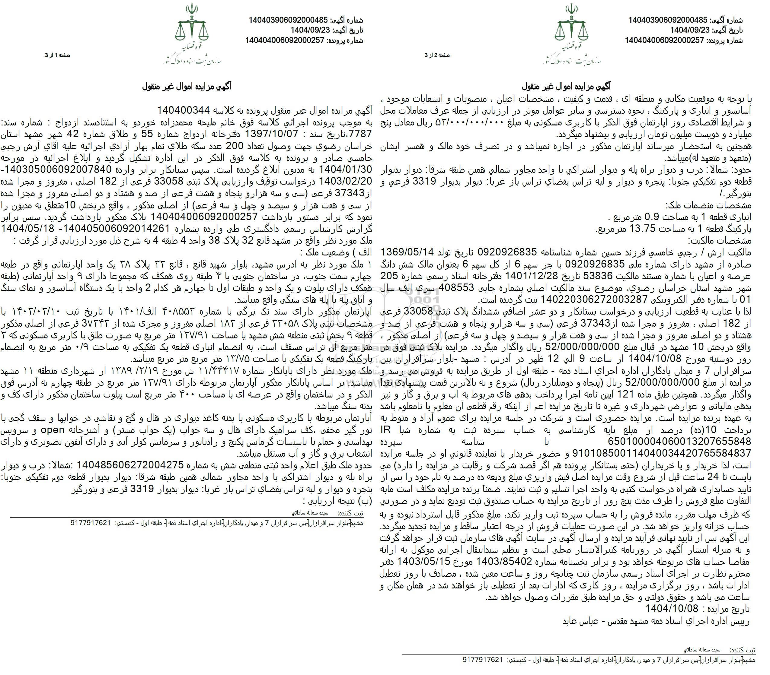 آگهی مزایده اموال غیر منقول پرونده به کلاسه 140400344