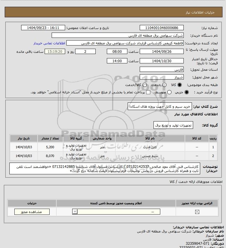 نام سازمان خریدار: شرکت سهامی برق منطقه ای فارس