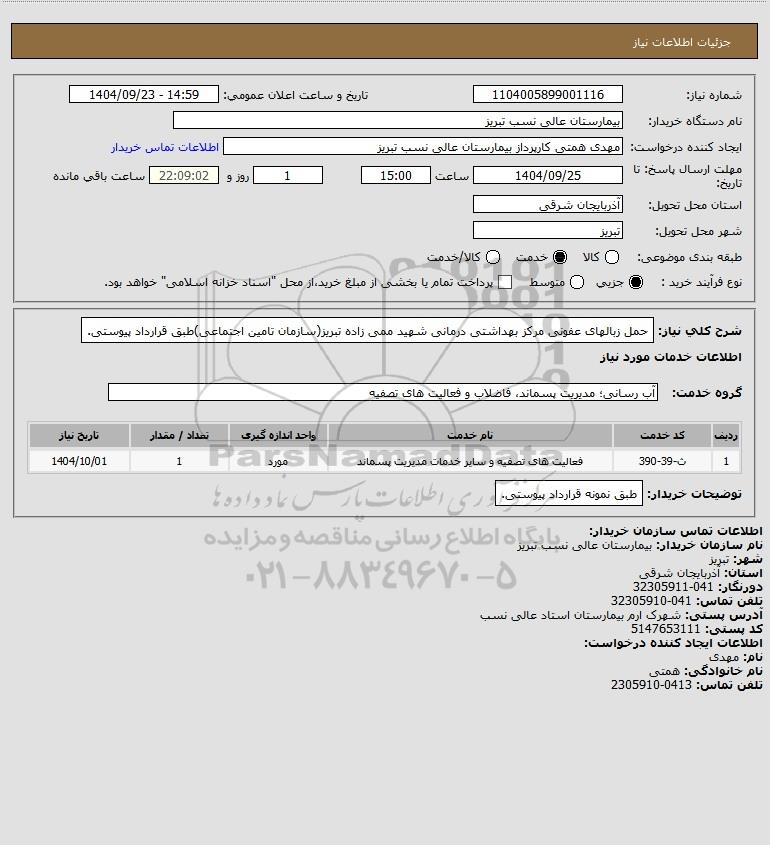 شرح کلی نیاز: حمل زبالهای عفونی مرکز بهداشتی درمانی شهید ممی زاده تبریز(سازمان تامین اجتماعی)طبق قرارداد پیوستی.