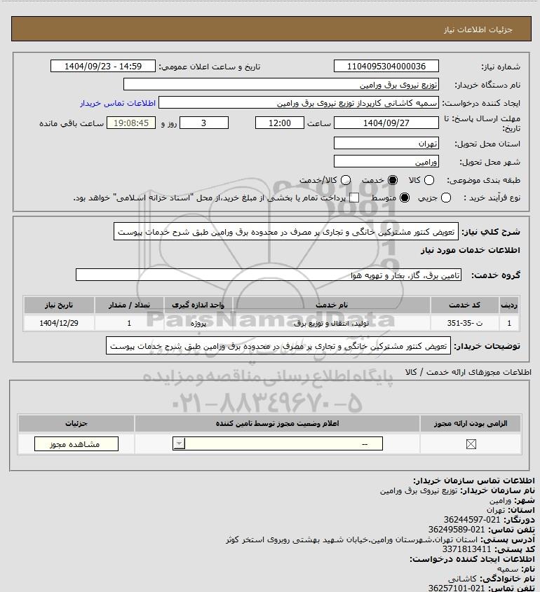 شرح کلی نیاز: تعویض کنتور مشترکین خانگی و تجاری پر مصرف در محدوده برق ورامین طبق شرح خدمات پیوست
