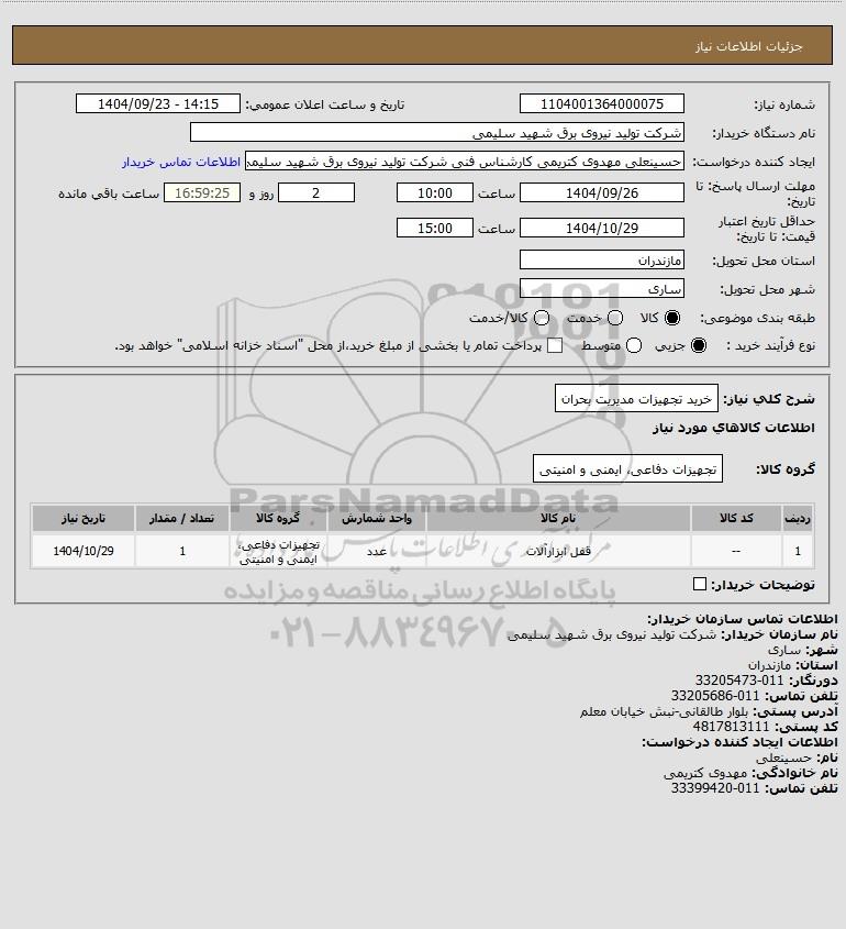 شرح کلی نیاز: خرید تجهیزات مدیریت بحران