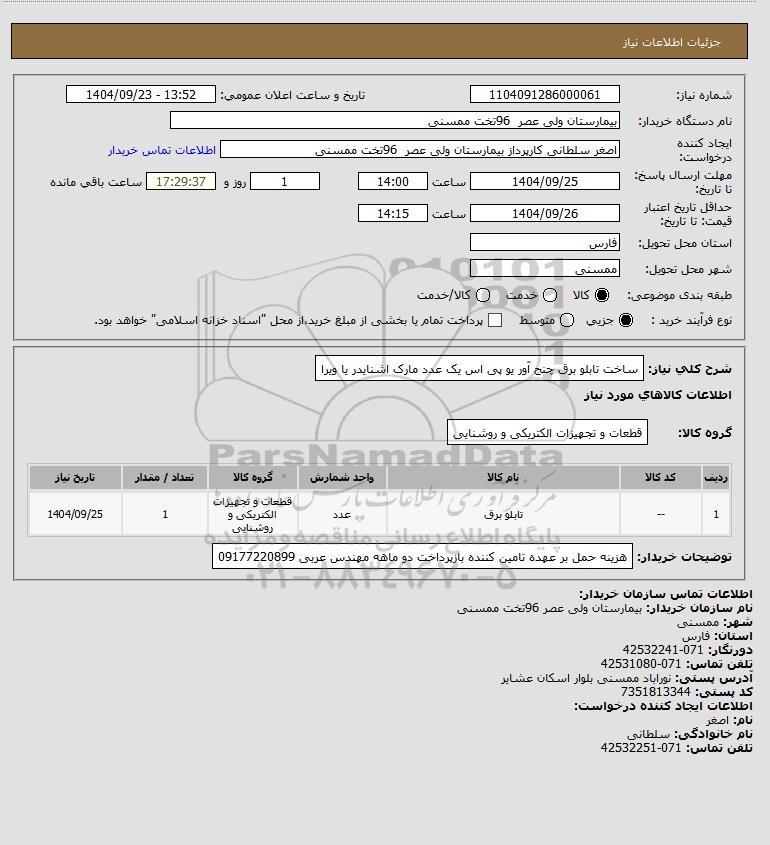 1 -- تابلو برق عدد قطعات و تجهیزات الکتریکی و روشنایی 1 1404/09/25