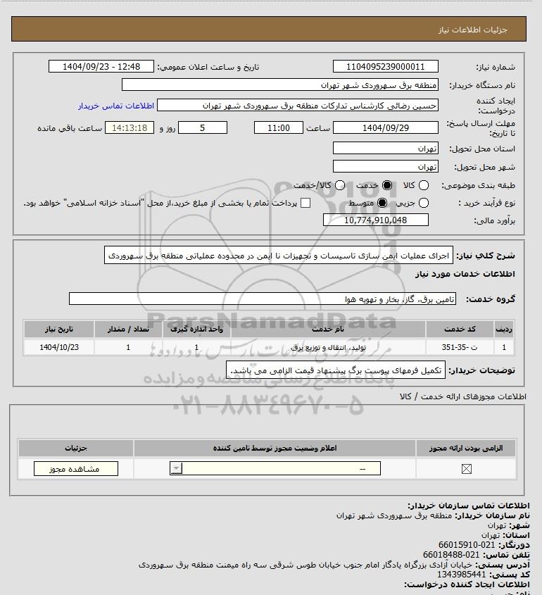 شرح کلی نیاز: اجرای عملیات ایمن سازی تاسیسات و تجهیزات نا ایمن در محدوده عملیاتی منطقه برق سهروردی