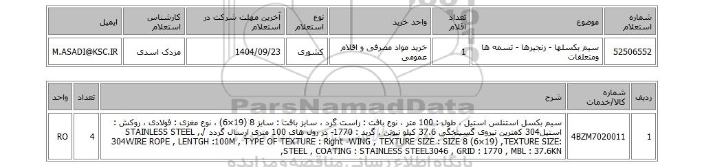 | 1 | 4BZM7020011 | سیم بکسل استنلس استیل ، طول : 100 متر ، نوع بافت : راست گرد ، سایز بافت : سایز 8 (19×6) ، نوع مغزی : فولادی ، روکش : استیل304 کمترین نیروی گسیتخگی 37.6 کیلو نیوتن ، گرید : 1770- در رول های 100 متری ارسال گردد /., STAINLESS STEEL 304WIRE ROPE , LENTGH :100M , TYPE OF TEXTURE : Right -WING , TEXTURE SIZE : SIZE 8 (6×19) ,TEXTURE SIZE: STEEL , COATING : STAINLESS STEEL3046 , GRID : 1770 , MBL : 37.6KN, | 4 | RO |