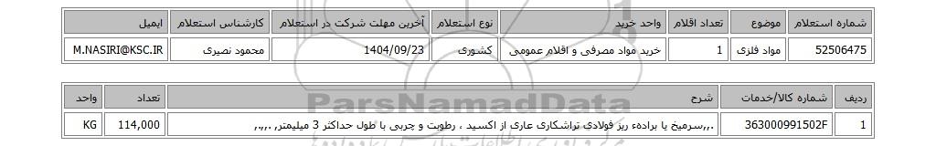 | 52506475 | مواد فلزی | 1 | خرید مواد مصرفی و اقلام عمومی | کشوری | 1404/09/23 | محمود نصیری | M.NASIRI@KSC.IR |