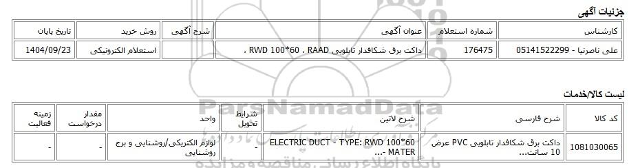 | علی ناصرنیا - 05141522299 | 176475 | داکت برق شکافدار تابلویی RWD 100*60 ، RAAD ، | استعلام الکترونیکی | 1404/09/23 |