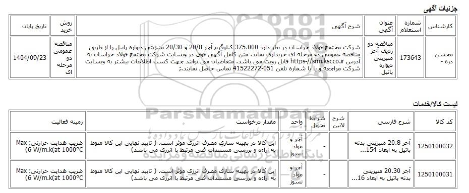 محسن دره - 173643مناقصه دو ردیف آجر منیزیتی دیواره پاتیلشرکت مجتمع فولاد خراسان در نظر دارد 375،000 کیلوگرم آجر 20/8 و 20/30 منیزیتی دیواره پاتیل را از طریق مناقصه عمومی دو مرحله ای خریداری نماید. متن کامل آگهی فوق در وبسایت شرکت مجتمع فولاد خراسان به آدرس https-//srm.kscco.ir قابل رویت می باشد. متقاضیان می توانند جهت کسب اطلاعات بیشتر به وبسایت شرکت مراجعه و یا با شماره تلفن 051-41522272 تماس حاصل نمایند.;مناقصه عمومی دو مرحله ای1404/09/23