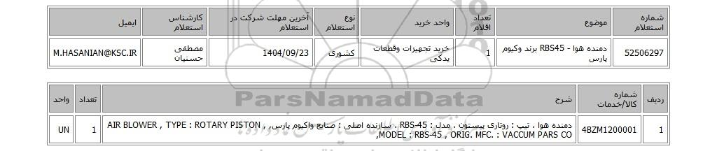 | 52506297 | دمنده هوا - RBS45 برند وکیوم پارس | 1 | خرید تجهیزات وقطعات یدکی | کشوری | 1404/09/23 | مصطفی حسنیان | M.HASANIAN@KSC.IR |