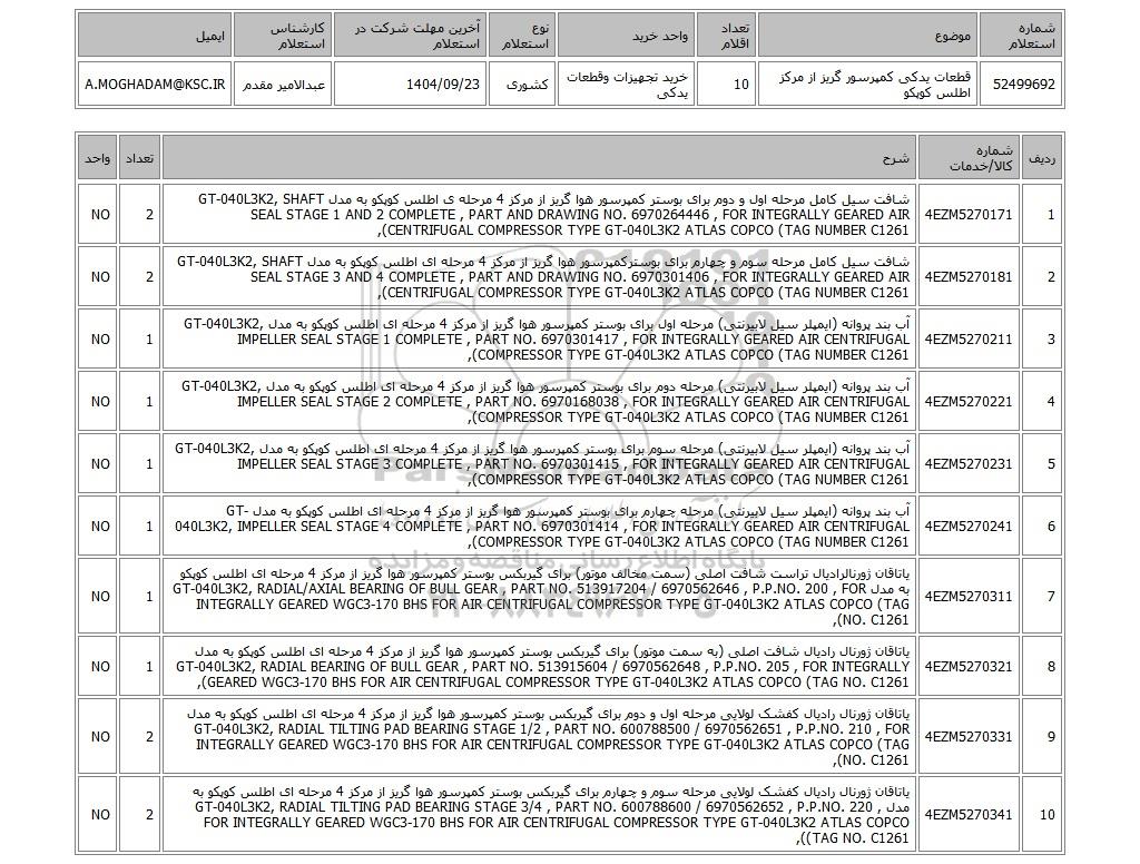 | 52499692 | قطعات یدکی کمپرسور گریز از مرکز اطلس کوپکو | 10 | خرید تجهیزات وقطعات یدکی | کشوری | 1404/09/23 | عبدالامیر مقدم | A.MOGHADAM@KSC.IR |