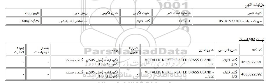 | مهران دیوان - 05141522301 | 173201 | گلند فلزی | استعلام الکترونیکی | 1404/09/25 |
