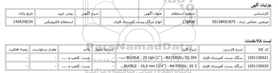 | مرتضی جمالی شاد - 05138451875 | 176838 | انواع سگک بست کمربندی فلزی | استعلام الکترونیکی | 1404/09/24 |