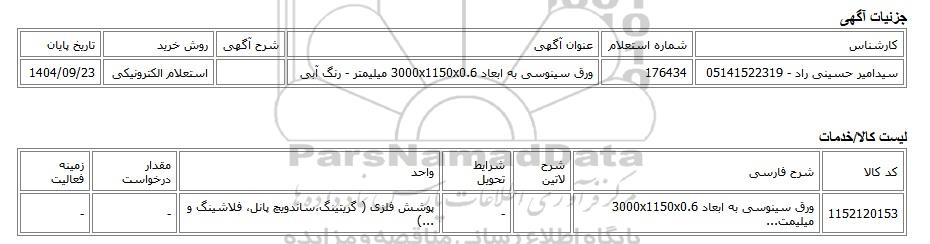 | سیدامیر حسینی راد - 05141522319 | 176434 | ورق سینوسی به ابعاد 3000x1150x0.6 میلیمتر - رنگ آبی | استعلام الکترونیکی | 1404/09/23 |