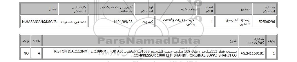 | 52506296 | پیستون کمپرسور شاهین | 1 | خرید تجهیزات وقطعات یدکی | کشوری | 1404/09/23 | مصطفی حسنیان | M.HASANIAN@KSC.IR |