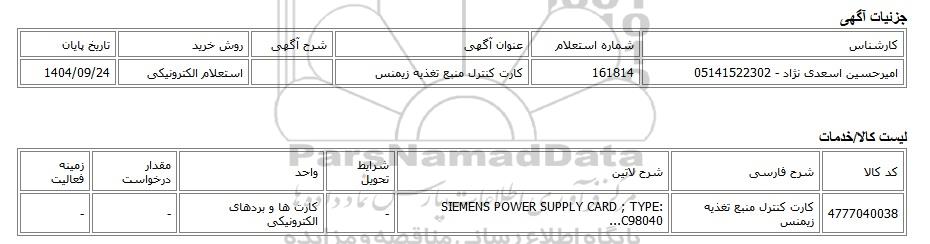 | امیرحسین اسعدی نژاد - 05141522302 | 161814 | کارت کنترل منبع تغذیه زیمنس | استعلام الکترونیکی | 1404/09/24 |