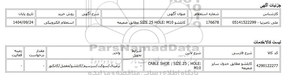 | علی ناصرنیا - 05141522299 | 176678 | کابلشو SIZE 25 HOLE: M10 مطابق ضمیمه | استعلام الکترونیکی | 1404/09/24 |