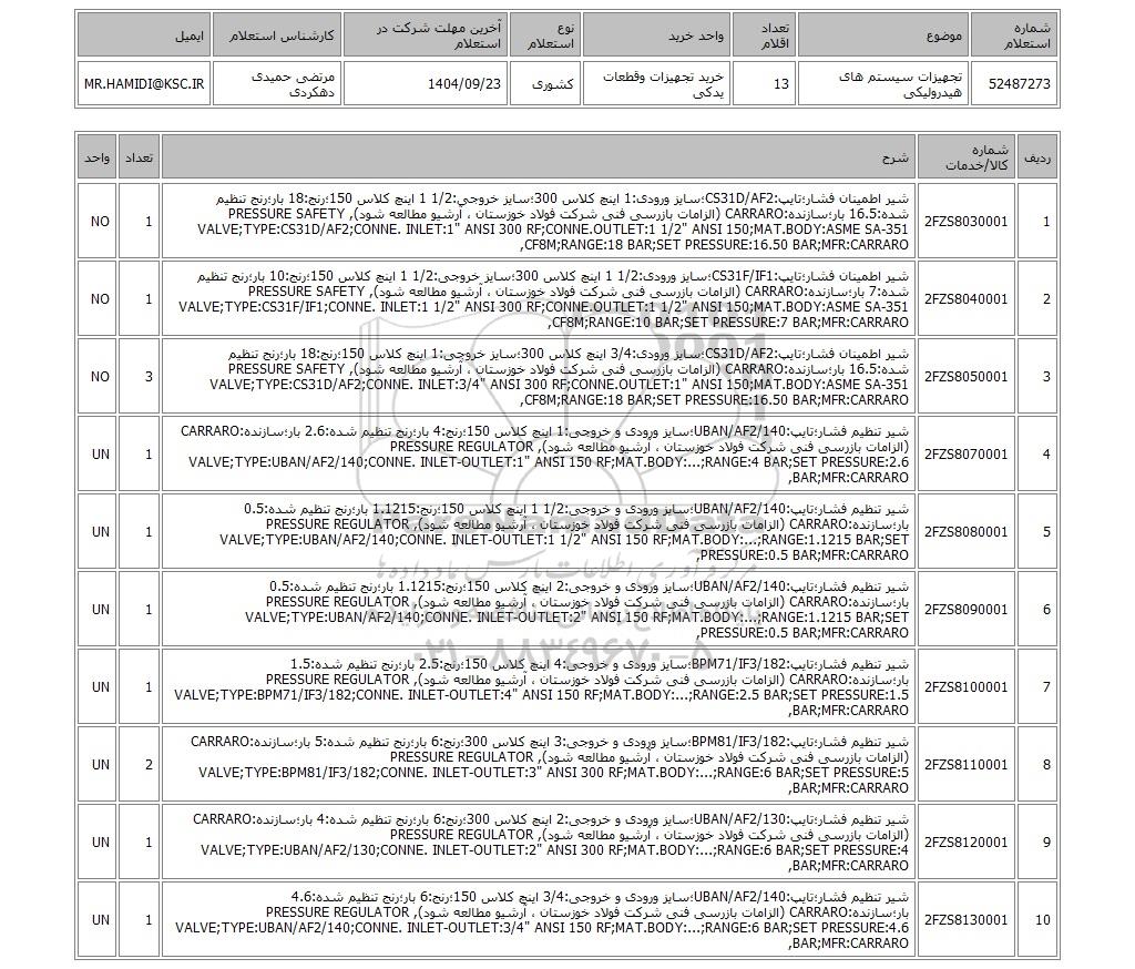 52487273تجهیزات سیستم های هیدرولیکی13خرید تجهیزات وقطعات یدکیکشوری1404/09/23مرتضی حمیدی دهکردیMR.HAMIDI@KSC.IR