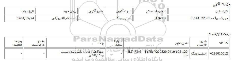 | مهران دیوان - 05141522301 | 176382 | اسلیپ رینگ | استعلام الکترونیکی | 1404/09/24 |