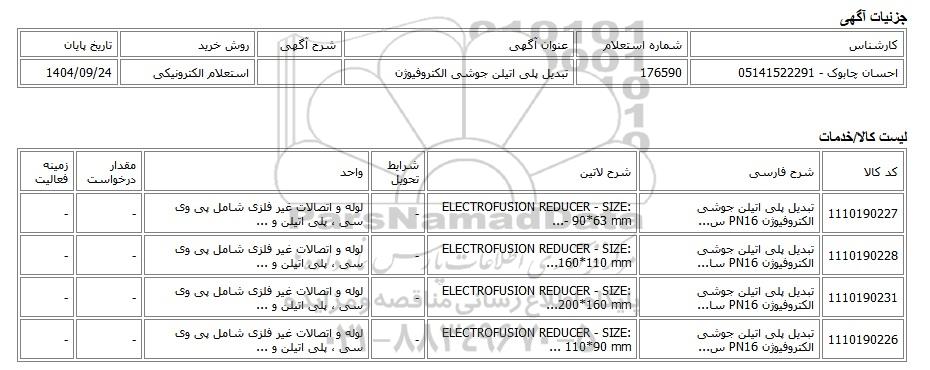 | احسان چابوک - 05141522291 | 176590 | تبدیل پلی اتیلن جوشی الکتروفیوژن | استعلام الکترونیکی | 1404/09/24 |