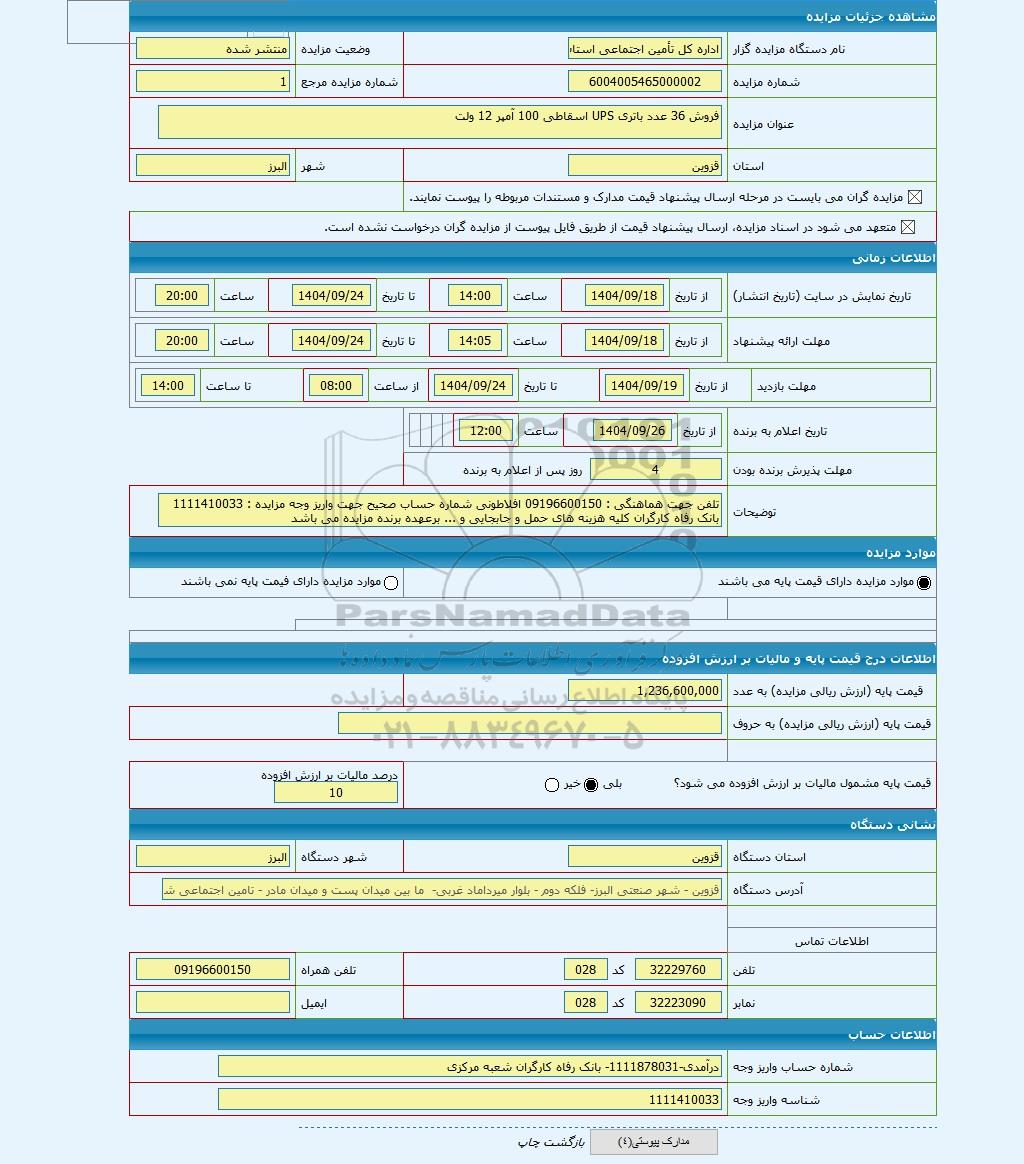 مزایده عمومی مزایده فروش 36 عدد باتری UPS اسقاطی 100 آمپر 12 ولت برگزار میگردد. از کلیه افراد متخصص و شرکت‌های واجد شرایط دعوت به عمل می‌آید تا در این مزایده با کد خبرگزاری پارس نماد : 9996722 شرکت نمایند تاریخ شروع مزایده : 1404/09/18 مهلت شرکت در مزایده: تا پایان روز 1404/09/24 مکان برگزاری اموال واگذاری استان‌های قزوین و دسته‌بندی‌های مربوط به این حراجی برق, منابع تغذیه میباشد.