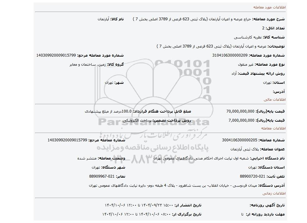 | شرح مورد معامله: حراج عرصه و اعیان آپارتمان (پلاک ثبتی 623 فرعی از 3789 اصلی بخش 7 ) | نام کالا: آپارتمان | |