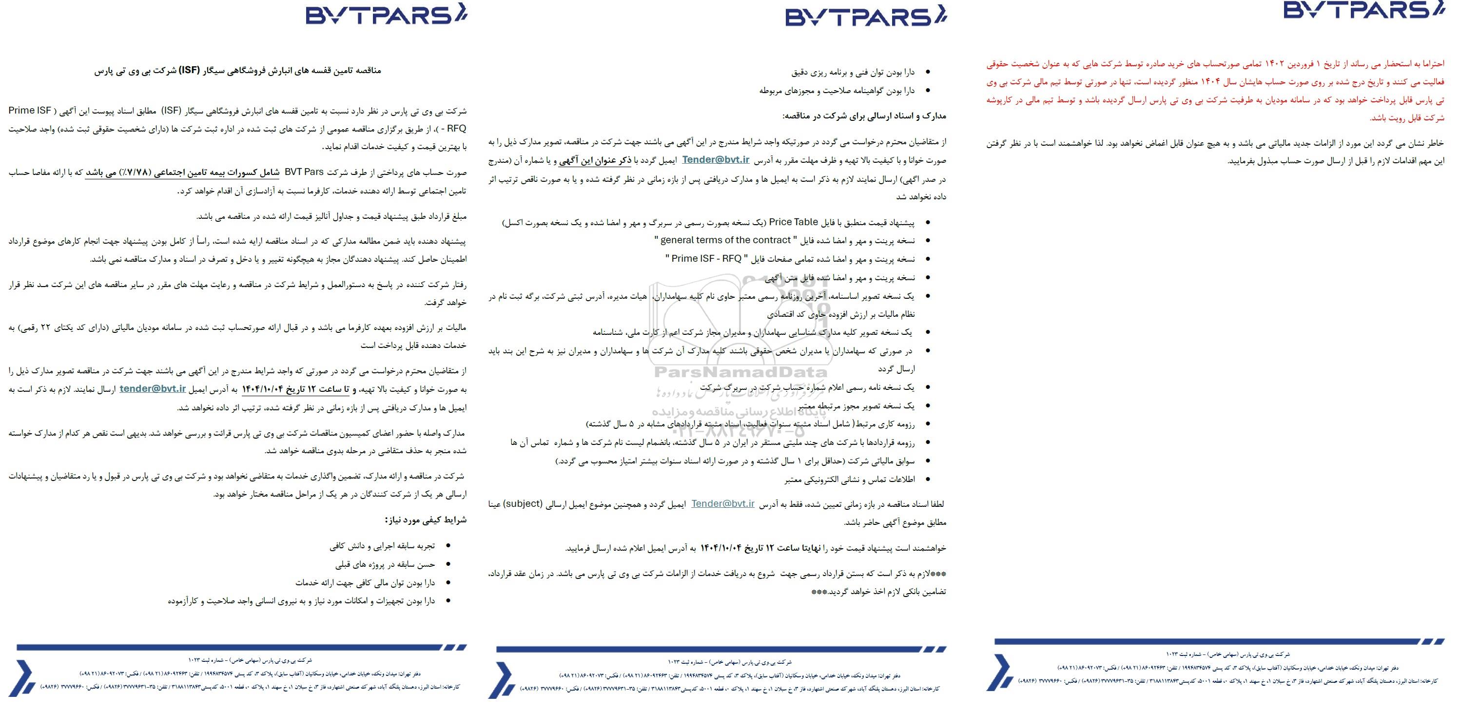 شرکت بی وی تی پارس در نظر دارد نسبت به تامین قفسه های انبارش فروشگاهی سیگار (ISF) مطابق اسناد پیوست این آگهی (Prime ISF - RFQ )، از طریق برگزاری مناقصه عمومی از شرکت های ثبت شده در اداره ثبت شرکت ها (دارای شخصیت حقوقی ثبت شده) واجد صلاحیت با بهترین قیمت و کیفیت خدمات اقدام نماید.