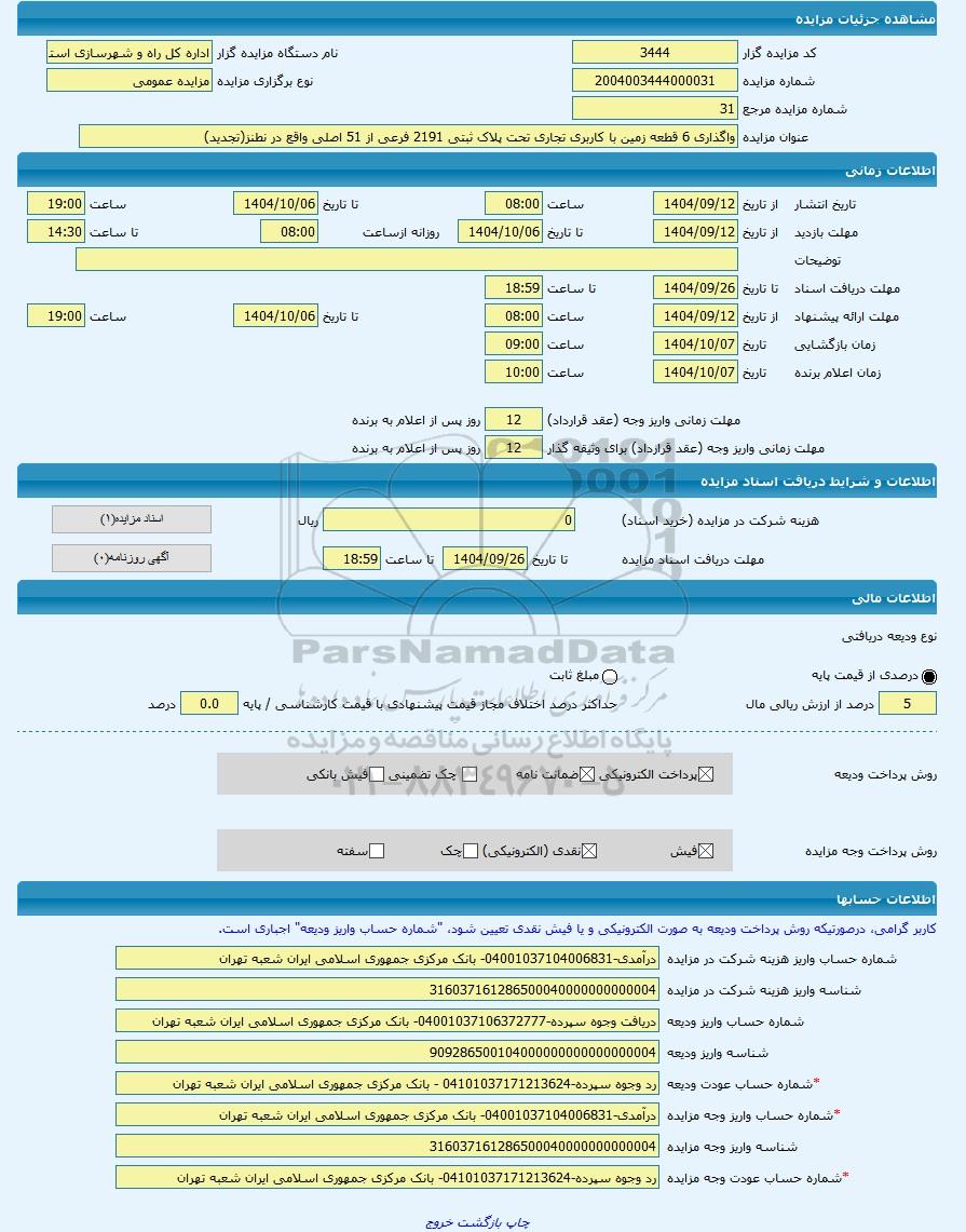 | عنوان مزایده | واگذاری 6 قطعه زمین با کاربری تجاری تحت پلاک ثبتی 2191 فرعی از 51 اصلی واقع در نطنز(تجدید) -مزایده زمین - استان اصفهان | |||
