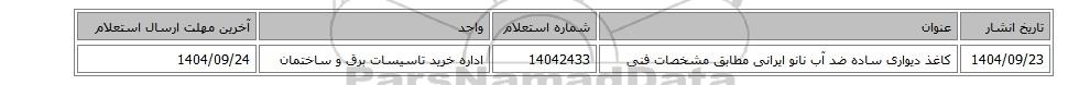 | 1404/09/23 | کاغذ دیواری ساده ضد آب نانو ایرانی مطابق مشخصات فنی | 14042433 | اداره خرید تاسیسات برق و ساختمان | 1404/09/24 |
