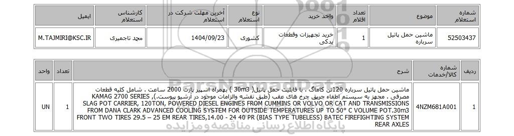 | 52503437 | ماشین حمل پاتیل سرباره | 1 | خرید تجهیزات وقطعات یدکی | کشوری | 1404/09/23 | محمد تاجمیری | M.TAJMIRI@KSC.IR |