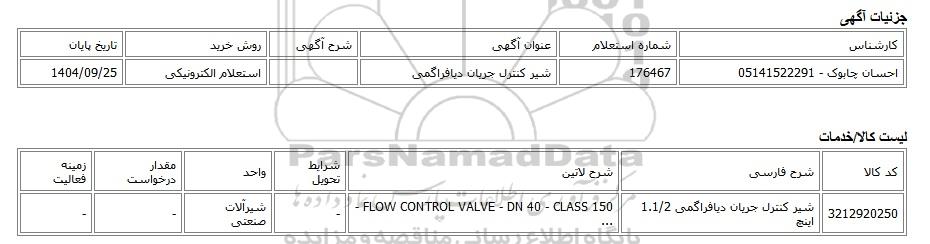 | احسان چابوک - 05141522291 | 176467 | شیر کنترل جریان دیافراگمی | استعلام الکترونیکی | 1404/09/25 |