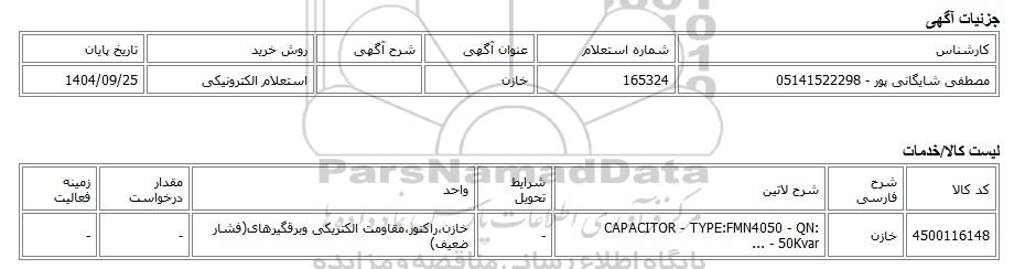 | مصطفی شایگانی پور - 05141522298 | 165324 | خازن | استعلام الکترونیکی | 1404/09/25 |