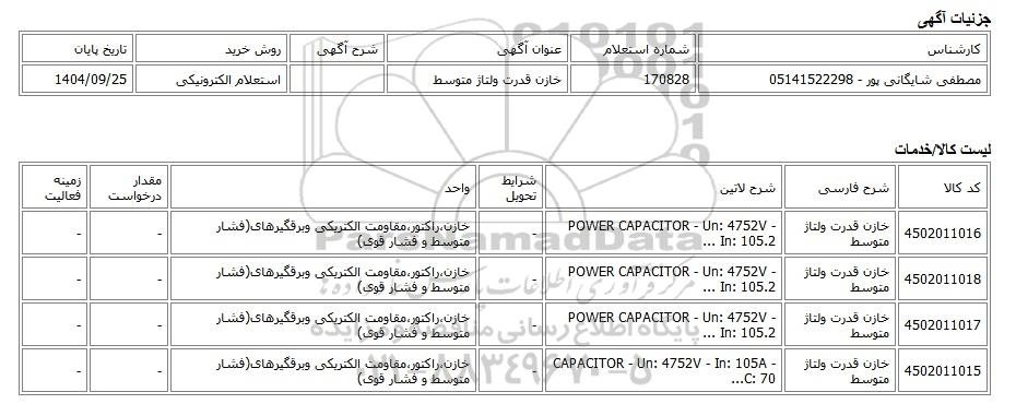 | مصطفی شایگانی پور - 05141522298 | 170828 | خازن قدرت ولتاژ متوسط | استعلام الکترونیکی | 1404/09/25 |