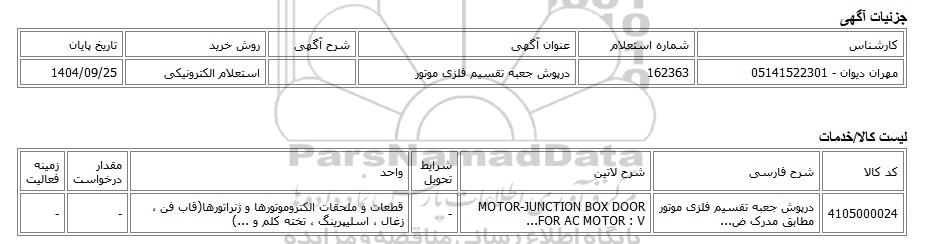 | مهران دیوان - 05141522301 | 162363 | درپوش جعبه تقسیم فلزی موتور | استعلام الکترونیکی | 1404/09/25 |
