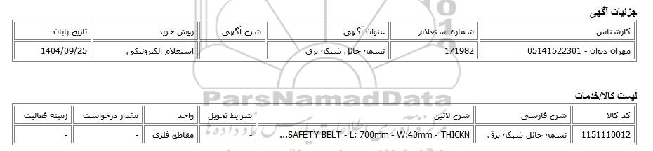 | مهران دیوان - 05141522301 | 171982 | تسمه حائل شبکه برق | استعلام الکترونیکی | 1404/09/25 |