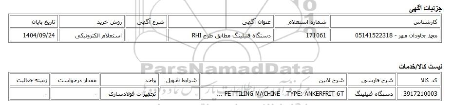 | محمد جاودان مهر - 05141522318 | 171061 | دستگاه فتیلینگ مطابق طرح RHI | استعلام الکترونیکی | 1404/09/24 |