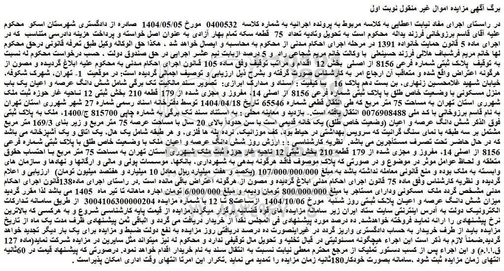 در راستای اجرای مفاد نیابت اعطایی به کلاسه مربوط به پرونده اجرائیه به شماره کلاسه  0400532  مورخ 1404/05/05  صادره از دادگستری شهرستان اسکو  محکوم علیه آقای قاسم برزوخانی فرزند یداله  محکوم است به تحویل وتادیه تعداد  75  قطعه سکه تمام بهار آزادی به عنوان اصل خواسته و پرداخت هزینه دادرسی متناسب  که در اجرای ماده 5 قانون حمایت خانواده 1391 در مرحله اجرای احکام مدنی از محکوم به محاسبه و ایصال خواهد شد ، هکذا حق الوکاله وکیل طبق تعرفه قانونی درحق محکوم لها خانم مریم فرشباف هلالی فرزند حسینعلی  با وکالت خانم مریم شجاعی راد  و 5 درصد ازبابت نیم عشر اجرایی در حق صندوق دولت ، حسب درخواست محکوم له نسبت به توقیف  پلاک ثبتی شماره فرعی 8156 از اصلی  بخش 12  اقدام و مراتب توقیف وفق ماده 105 قانون اجرای احکام مدنی به محکوم علیه ابلاغ گردیده و مصون از هرگونه اعتراض واقع شده و متعاقب آن ارجاع امر به کارشناس صورت گرفته و بشرح ذیل ارزیابی و توصیف اجمالی گردیده است: در موقعیت  1- تهران، شهرک شکوفه، خیابان شهید غلامحسین زنهاری، بن بست دهم پلاک 16   با کیفیت : اسناد و مدارک ابرازی:  تصویر سند مالکیت تک برگی شامل شش دانگ عرصه و اعیان یک باب منزل مسکونی با وضعیت خاص طلق با پلاک ثبتی شماره فرعی 8156 از اصلی 14، مفروز و مجزی شده از 179 قطعه 210 بخش ثبتی 12 ناحیه غار حوزه ثبت ملک شهرری استان تهران به مساحت 75 متر مربع که طی انتقال قطعی شماره 65546 تاریخ 1404/04/18 توسط دفترخانه اسناد رسمی شماره 27 شهر شهرری استان تهران به نام قاسم برزوخانی با کد ملی 0076908488 انتقال یافته است.- بازدید و معاینه محلی : به استناد سند تک برگی به شماره چاپی 815700 ج/1400، ملک به پلاک ثبتی فوق الذکر شش دانگ عرصه و اعیان (وضعیت خاص طلق) یک خانه قدیمی است با سن حدوداً بالای 20 سال با مساحت عرصه 75 متر مربع و زیر بنای 169/3 متر مربع مشتمل بر سه طبقه با نمای سنگ گرانیت که سرویس بهداشتی در حیاط بود، کف موزائیک، نرده پله ها فلزی، و هر طبقه شامل یک هال، یک اتاق و یک آشپزخانه می باشد که در حال حاضر تحت تصرف مستأجرین می باشد.  نظریه کارشناسی : : ارزش روز شش دانگ عرصه و اعیان ملک با وضعیت خاص طلق با پلاک ثبتی شماره فرعی 8156 از اصلی 14، مفروز و مجزی شده از 179 قطعه 210 بخش ثبتی 12 ناحیه غار حوزه ثبت ملک شهرری استان تهران به مساحت 75 متر مربع با احتساب حقوق متعلقه و لحاظ عوامل موثر در موضوع و در صورتی که پلاک موصوف فاقد هرگونه بدهی به شهرداری، بانکها، موسسات پولی و مالی و ارگانها و نهادها و سازمان های وابسته به ملک بوده و منع قانونی معامله نداشته باشد به مبلغ 107/000/000/000 (یکصد و هفت میلیارد ریال معادل 10 میلیارد و هفتصد میلیون تومان)  ارزیابی و اعلام گردیده و نظریه کارشناس وفق ماده 75 قانون اجرای احکام مدنی ابلاغ گردیده و مصون از هرگونه اعتراض باقی مانده است .در راستای اجرای ماده138قانون اجرای احکام مدنی مشخص گردد ملک  مسکونی ودارای مستاجر با مبلغ 800/000/000 تومان ودیعه و مبلغ 6/000/000 تومان اجاره ماهانه تا تیر ماه  1405 می باشد لذا مقرر گردید میزان شش دانگ عرصه و اعیان پلاک ثبتی روز شنبه  مورخ 1404/10/06  ازساعت8 تا 12 با شماره مزایده 3004106300000204  از طریق سامانه تدارکات الکترونیک دولت به آدرس اینترنتی سایت ستاد ایران زیر سامانه مزایده های قوه قضائیه برگزار میگردد.مزایده از قیمت پایه کارشناسی شروع و به هرکسی که بالاترین نرخ پیشنهادی را ارائه نماید فروخته خواهدشد. ده درصد مورد پیشنهادی فی المجلس نقداً از خریدار دریافت می گردد و الباقی ثمن پیشنهادی ظرف مدت یک ماه از تاریخ مزایده باید از طرف خریدار به حساب دادگستری واریز گردد در غیراینصورت ده درصد دریافتی روز مزایده به نفع دولت ضبط و مزایده برای یک بار دیگر تجدید خواهد گردید.ضمناً لازم به ذکر است این اجراء هیچگونه مسئولیتی در قبال تخلیه و تحویل مال توقیفی ندارد و محکوم له نیز میتواند مثل سایرین در مزایده شرکت نماید(ماده 127 ق.ا.ا.م) و این اجراء پس از کسب دستور تملیک از مرجع محترم مع