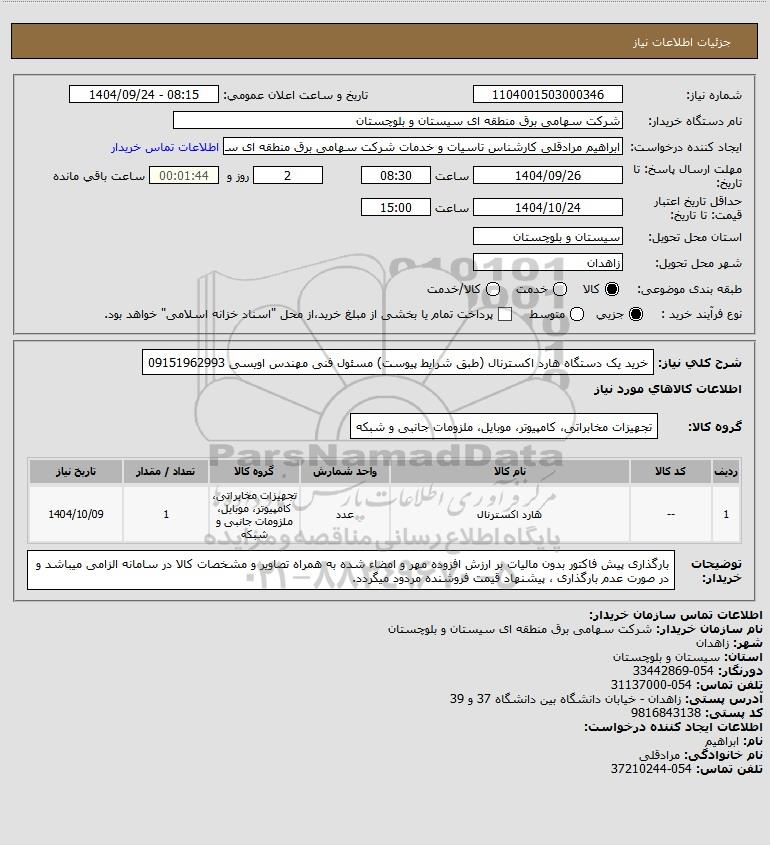 | 1 | -- | هارد اکسترنال | عدد | تجهیزات مخابراتی، کامپیوتر، موبایل، ملزومات جانبی و شبکه | 1 | 1404/10/09 |