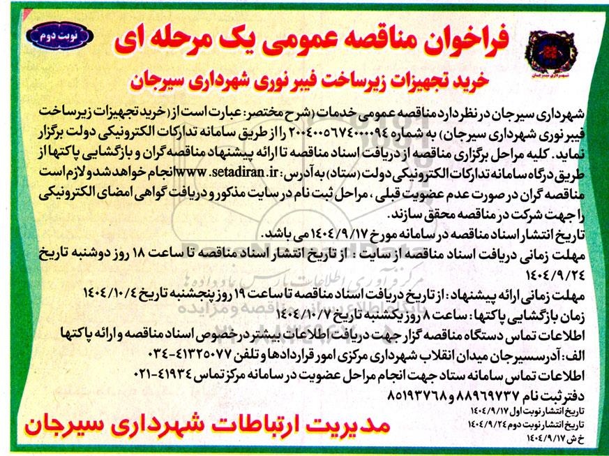 شهرداری سیرجان در نظر دارد مناقصه عمومی خدمات شرح مختصر : عبارت است از (خرید تجهیزات زیرساخت فیبر نوری شهرداری سیرجان) به شماره 2004005674000094 را از طریق سامانه تدارکات الکترونیکی دولت برگزار نماید. کلیه مراحل برگزاری مناقصه از دریافت اسناد مناقصه تا ارائه پیشنهاد مناقصه گران و بازگشایی پاکتها از طریق درگاه سامانه تدارکات الکترونیکی دولت (ستاد) به آدرس (ستاد ایران) انجام خواهد شد و لازم است مناقصه گران در صورت عدم عضویت قبلی، مراحل ثبت نام در سایت مذکور و دریافت گواهی امضای الکترونیکی را جهت شرکت در مناقصه محقق سازند.